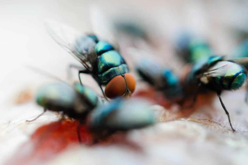 When house flies are nearby, you may hear the telltale buzzing noise of their wings beating together. Listen for the sound around garbage, dumpsters, drainpipes, and light fixtures.
